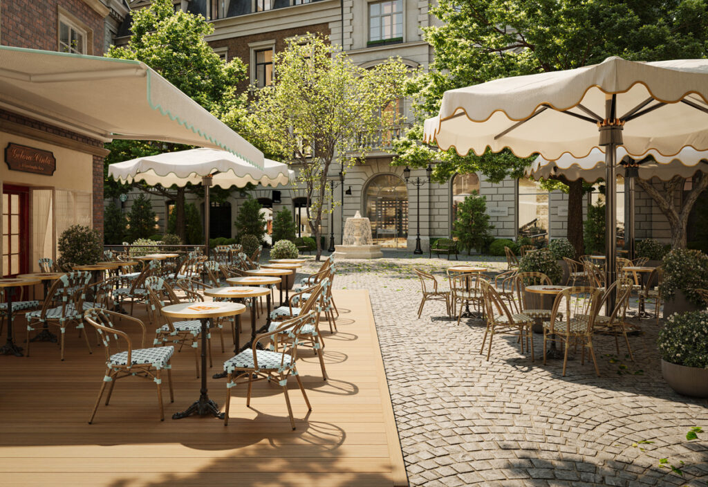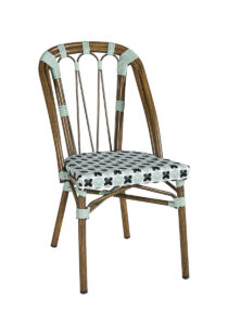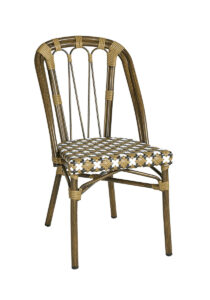 Chaise empilable Auteuil, structure en aluminium avec peinture epoxy en optique bambou, tressage PE disponible dans les coloris camel, blanc & brun ou vert pâle, noir & blanc