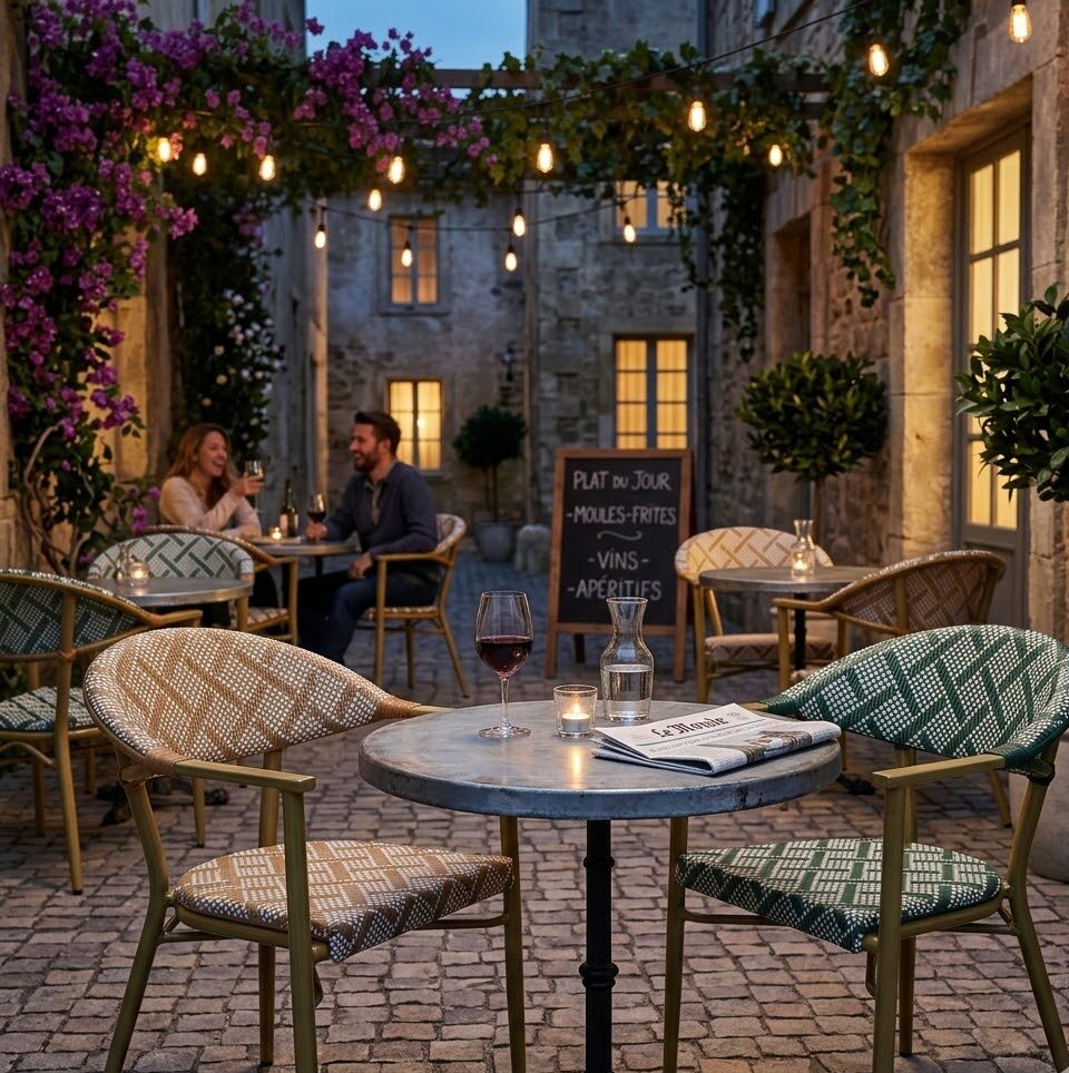 Fauteuil empilable Bercy, structure en aluminium avec peinture epoxy en optique bambou clair, tressage textilène 8×8, disponible dans les coloris blanc & camel ou crème & vert