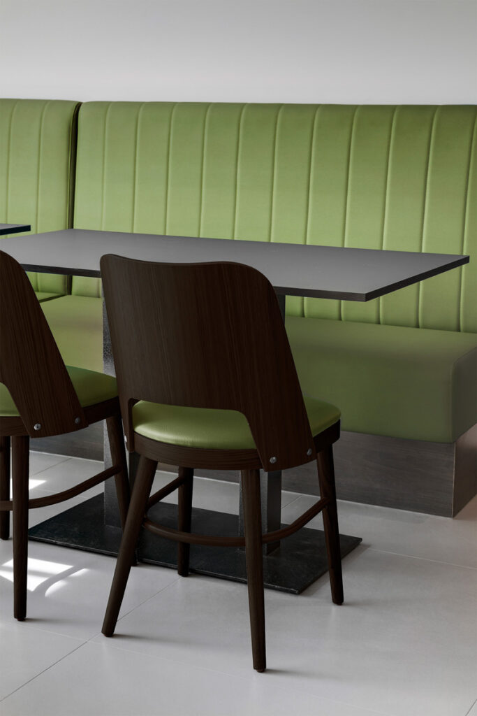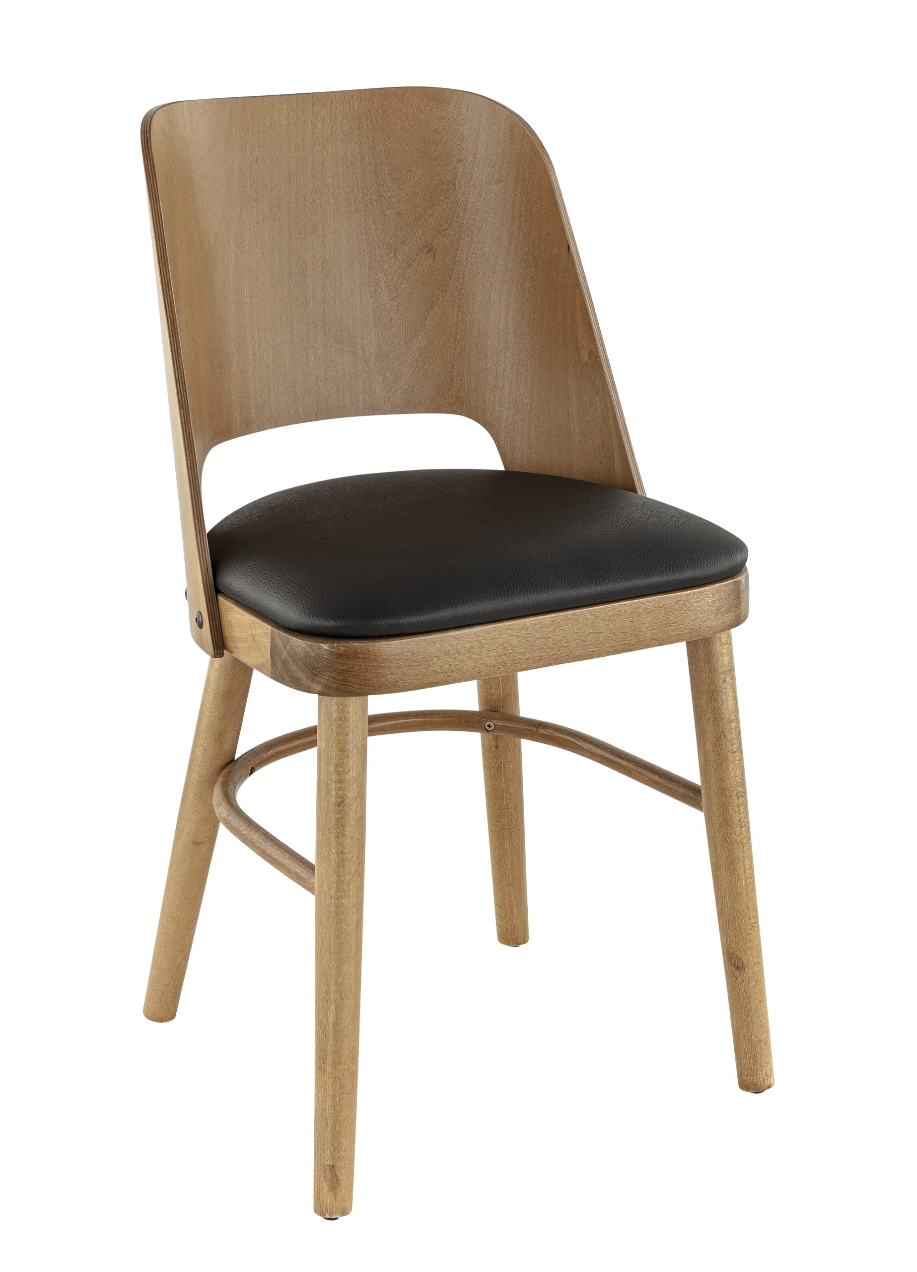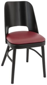 Chaise Budapest, structure en hêtre teinté (chêne miel ou wengé), assise garnie de similicuir PU LOTOS, disponible dans les coloris noir (7006), éléphant (5272), olive (9430), bordeaux (5269), cappuccino (5582) et terra (9244)