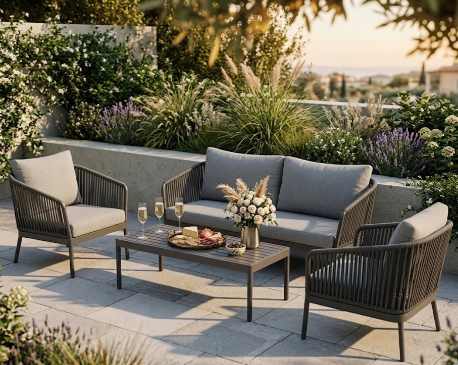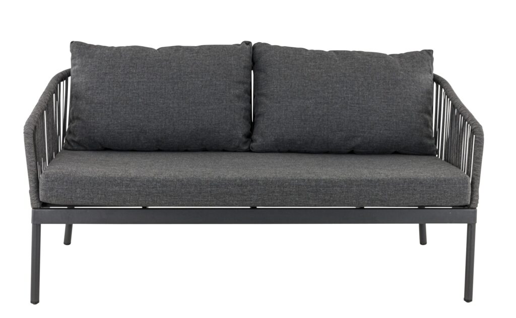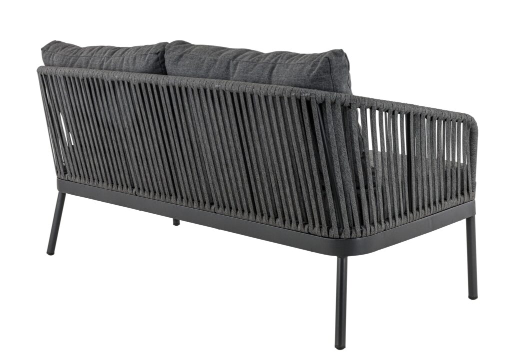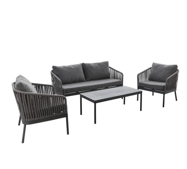 Set détente Cadix composé de 2 fauteuils détente, d’un sofa détente 2 places ainsi que d’une table basse, structure en aluminium avec peinture epoxy coloris anthracite, tressage corde en textilène, coussins polyester inclus