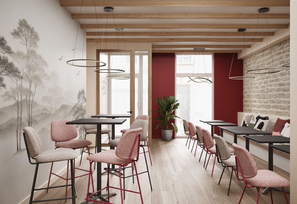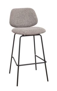 Tabouret César, structure en acier avec peinture epoxy, assise et dossier garnis de tissu Puente, disponible en structure coloris Syrah avec habillage en coloris bordeaux & greige (68) ou en structure coloris gris métal avec habillage en coloris greige & bleu gris (11)
