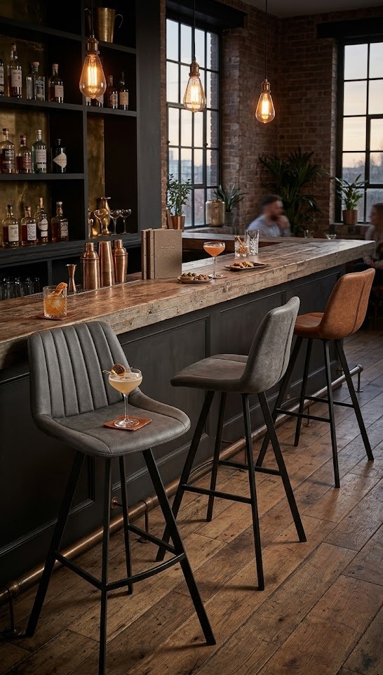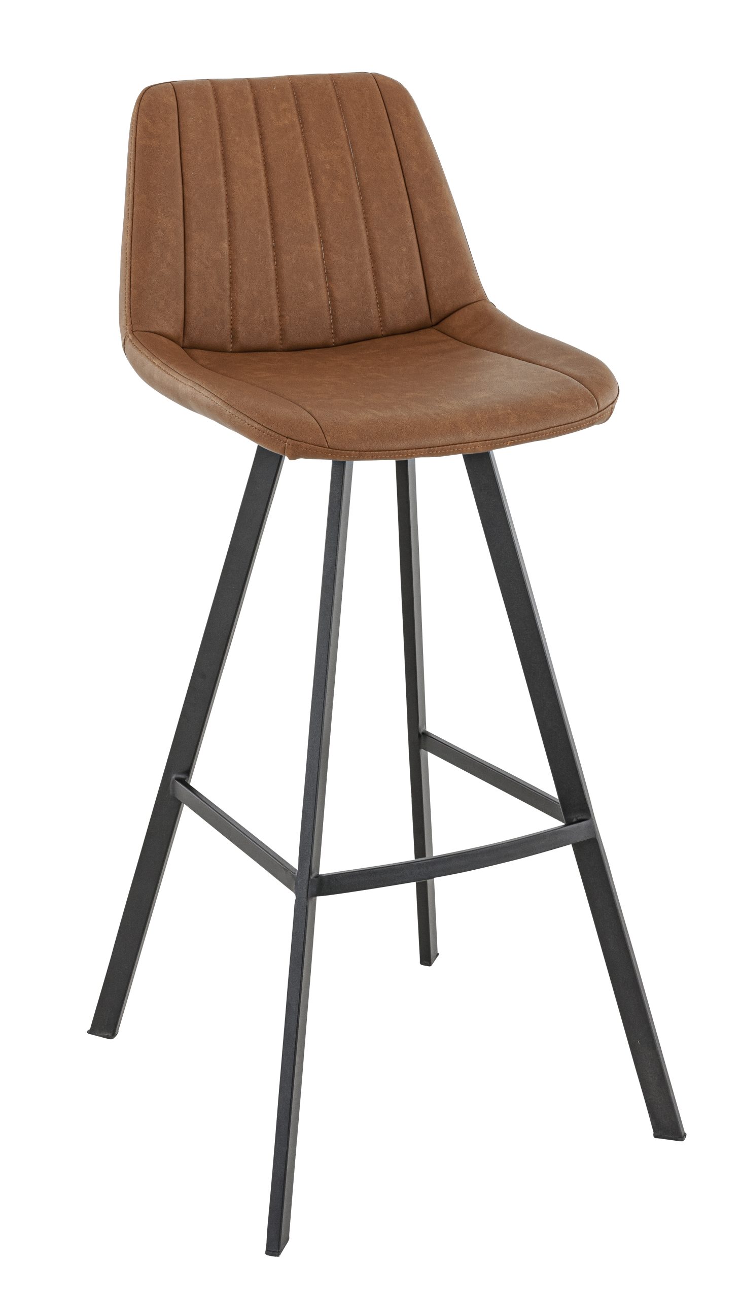 Tabouret Kyle, structure en métal noir, assise et dossier garnis de similicuir PU Colorado, disponible dans les coloris anthracite ou cuoio.