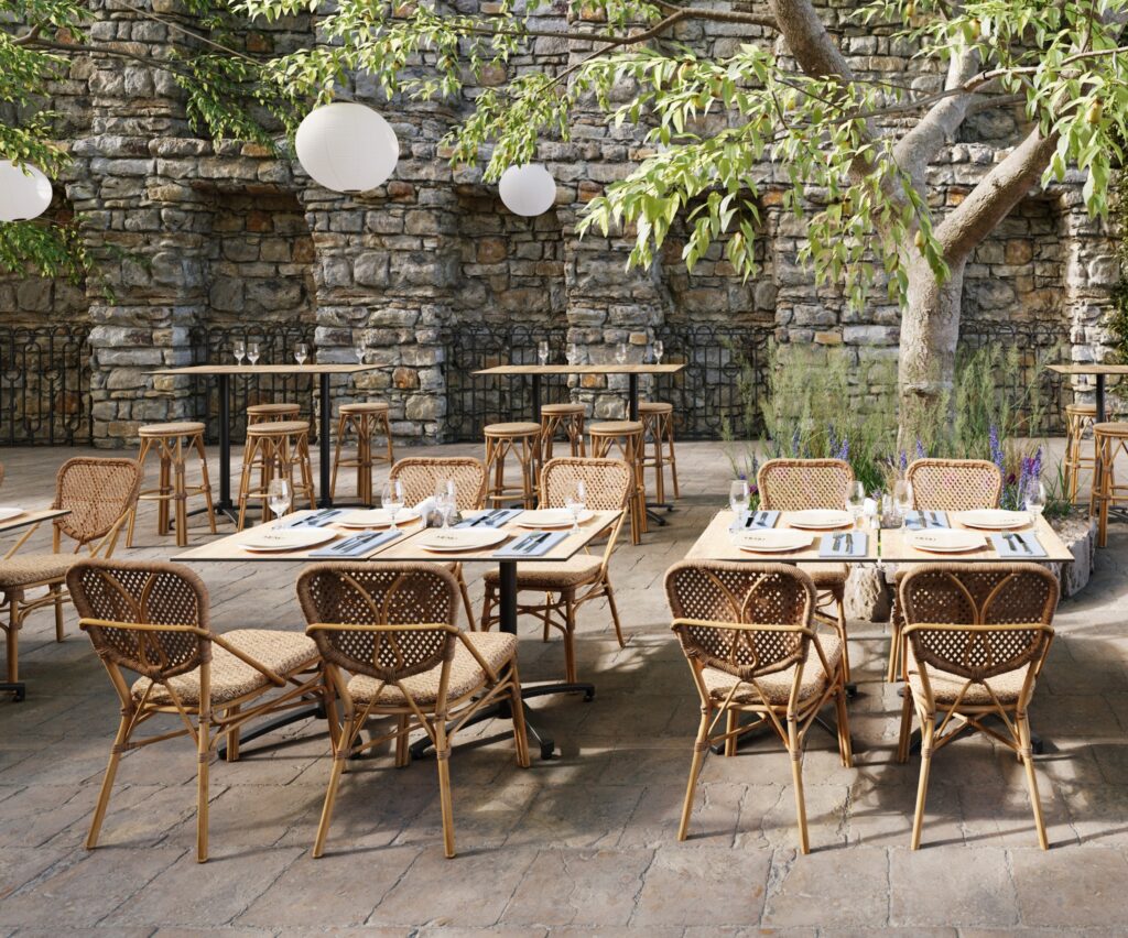 Tabouret Laval, structure en aluminium col. caramel, avec tressage PE imitation rotin coloris noisette