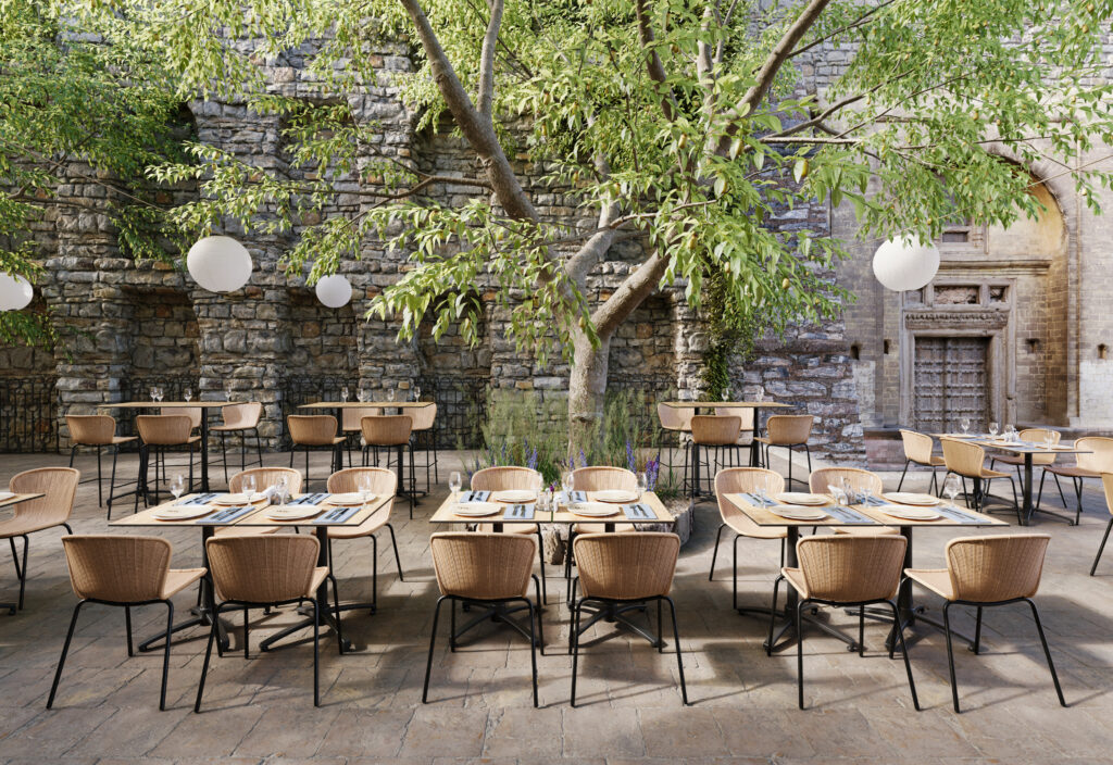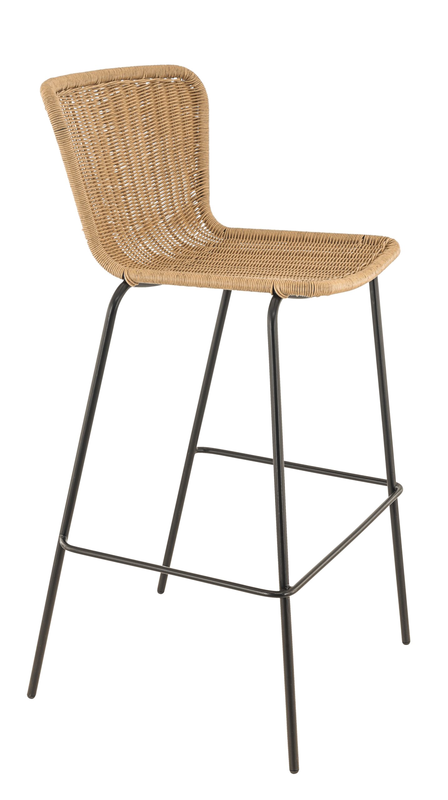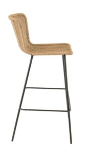 Tabouret empilable Loyd, structure métallique coloris noir, avec tressage PE imitation rotin coloris naturel.