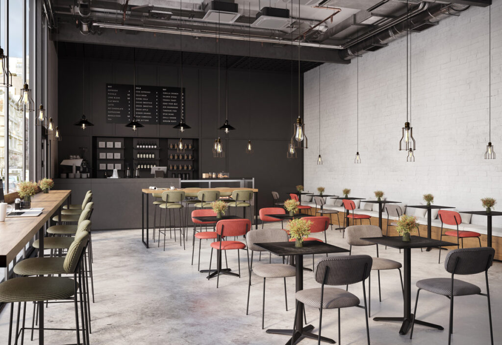 Chaise Manu, structure en acier noir, assise et dossier garnis de tissu Lincoln, disponible dans les coloris gris taupe (24), olive (37) ou tomette (57)