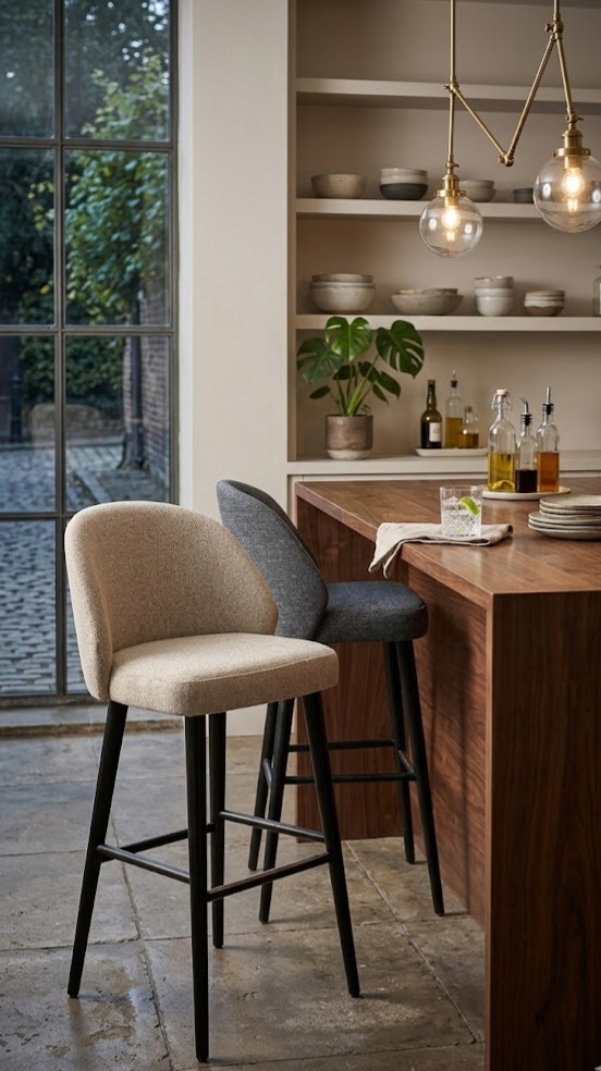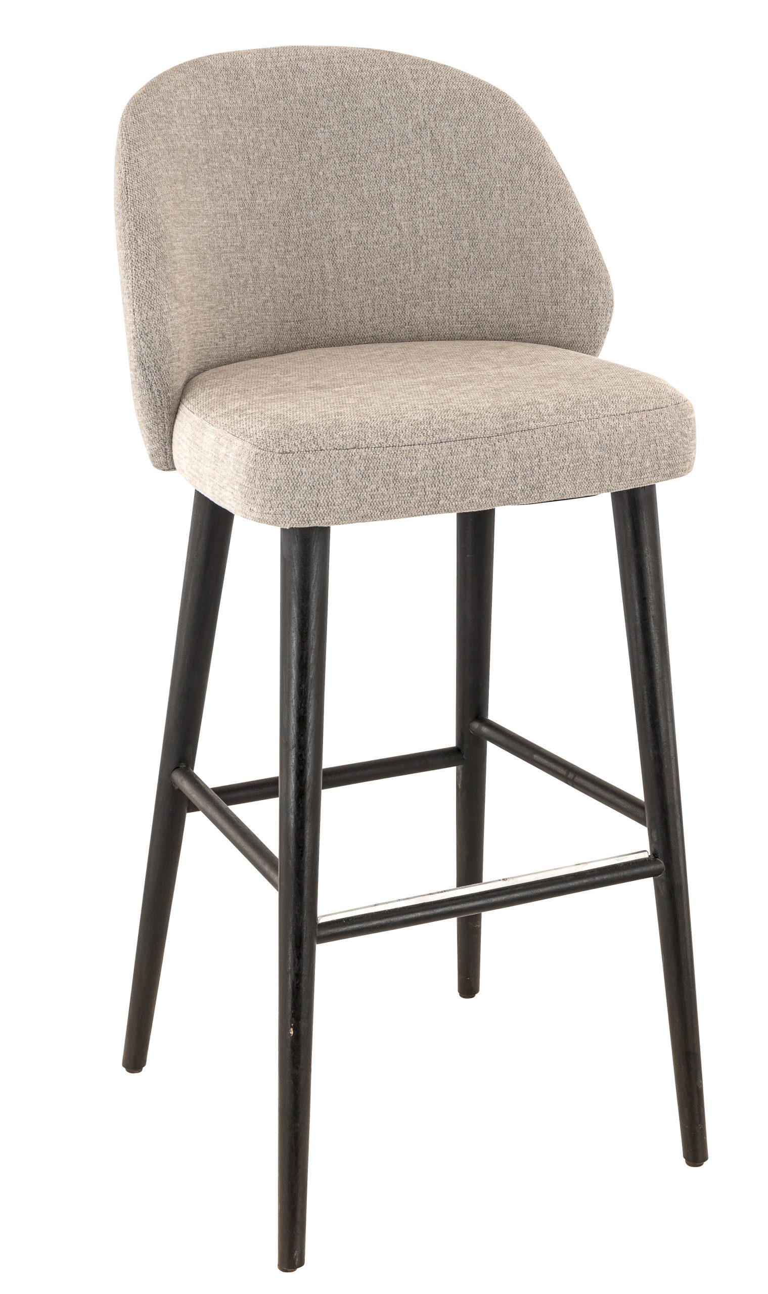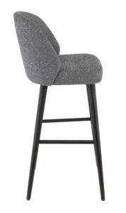 Tabouret Marius, structure en hêtre teinté noir, assise et dossier garnis de tissu Sorella, disponible dans les coloris greige (05) ou gris foncé (88)