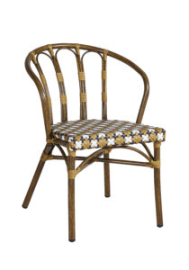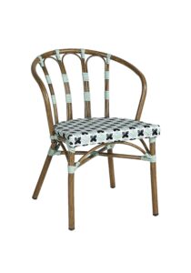 Chaise empilable Panama et fauteuil empilable Panama en aluminium imitation rotin, assise en tressage PE disponible dans les coloris vert eau/noir/blanc ou camel/brun/blanc